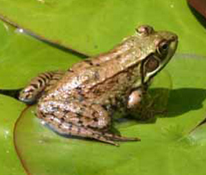 Northern Green Frog & Southern Green Frog Rana pipiens - Rana sphenocephala Natives of North America, Green frogs are green or greenish brown with creamy white undersides for females and yellow for males. They are typically green with a transition to brown, black marks dot the brown area of the frog. Two distinct ridges run down the back, from the eyes to the tail - this helps differentiate the green frog from immature bullfrogs. Occasionally unspotted green frogs occur.